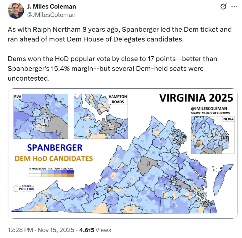 - Very interesting from J. Miles Coleman of Sabato’s Crystal Ball: “As with Ralph Northam 8 years ago, Spanberger led the Dem ticket and ran ahead of most Dem House of Delegates candidates. Dems won the HoD popular vote by close to 17 points–better than Spanberger’s 15.4% margin–but several Dem-held seats were uncontested.”