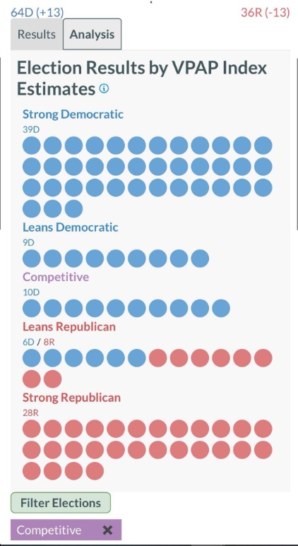 - From VPAP, election results by VPAP Index estimates show that Democratic candidates won ALL the “Strong Democratic” (39) and “Leans Democratic” (9) districts, as well as all the “Competitive” (10) districts, and even 6/14 “Leans Republican” districts. A blue tsunami, in other words!