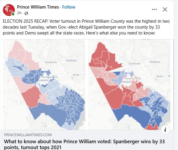 - From the Prince William Times, this illustrates very well the changing nature of politics in Prince William County, which has been trending blue for years now. Heck, even formerly solid-red parts of the county in the north and west are now either pink or light-blue. Amazing. More broadly, the Republican Party has been decimated throughout Northern Virginia, with very few elected Republicans left in inner NoVA (Arlington, Alexandria, Falls Church, Fairfax), and not many in more exurban NoVA (Loudoun, Prince William) either. Heck, even Stafford County and Spotsylvania County went for Spanberger, with some other parts of exurban NoVA going from bright-red to pink. Amazing.