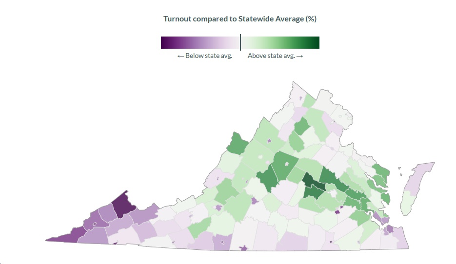 - From VPAP, this map shows that turnout was BELOW the state average in SW Virginia, parts of Southside Virginia, and also in parts of the Hampton Roads area. Turnout was above the state average in parts of central Virginia, the DC exurbs, etc.