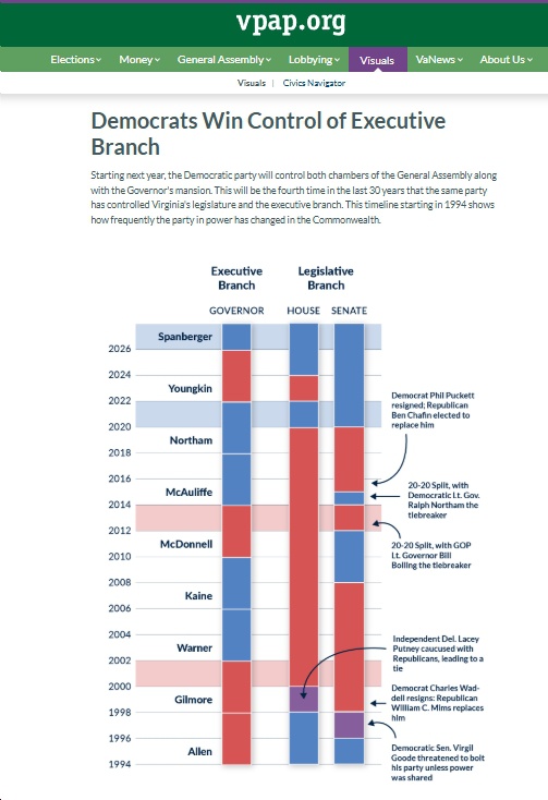 - From VPAP: As you can see, Democrats will now have a governing “trifecta” (governorship, House of Delegates, State Senate) in Richmond after four years of divided government, preceded by two years of an incredibly productive Democratic “trifecta” in 2020-2021. What’s truly amazing is how rarely Democrats have held a “trifecta” since 1994, and how rarely EITHER party has done so actually. Do voters prefer “divided government,” thus chose “divided government” deliberately, or what? One thing’s for sure; the last time Democrats had a “trifecta,” they got a LOT done – passing hundreds of bills that were signed into law by Gov. Ralph Northam. In contrast, the past four years, Glenn Youngkin has basically been a veto machine. So now that Democrats will hold a “trifecta,” we’ll presumably see a LOT of the bills Youngkin vetoed come back, pass the General Assembly and be signed into law by Gov. Abigail Spanberger. Good stuff.