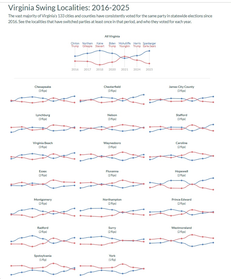 - From VPAP, here are some “swing localities” this year and historically. A few big ones include Virginia Beach, Chesterfield County, Stafford County, Chesapeake, etc.