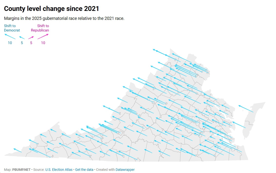 - From Philip Bump, here’s a map showing that pretty much every jurisdiction in Virginia shifted in the “blue” direction since 2021. What a difference four years, a different party in the White House, different candidates, etc. makes.