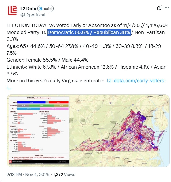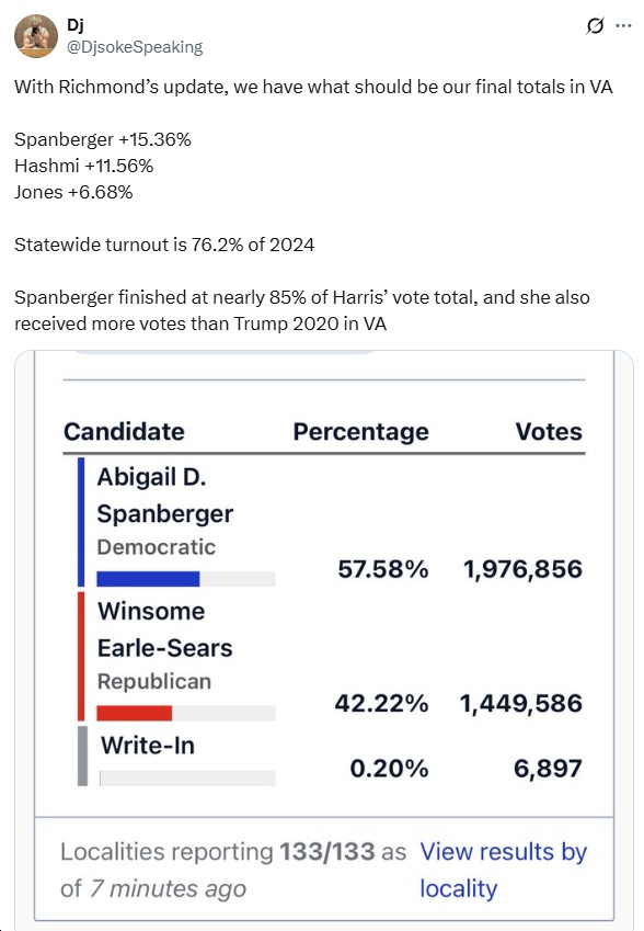 - Interesting points by DJ – “Statewide turnout is 76.2% of 2024; Spanberger finished at nearly 85% of Harris’ vote total, and she also received more votes than Trump 2020 in VA.”