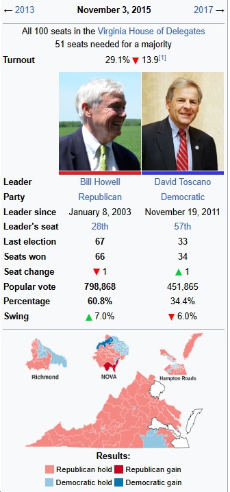 - From Wikipedia, it’s really striking to compare/contrast where House of Delegates Democrats were in November 2015 (just 34 seats; Republican Speaker Bill Howell seemingly entrenched forever…) compared to now (64 seats; Speaker Don Scott with a massive majority to work with).