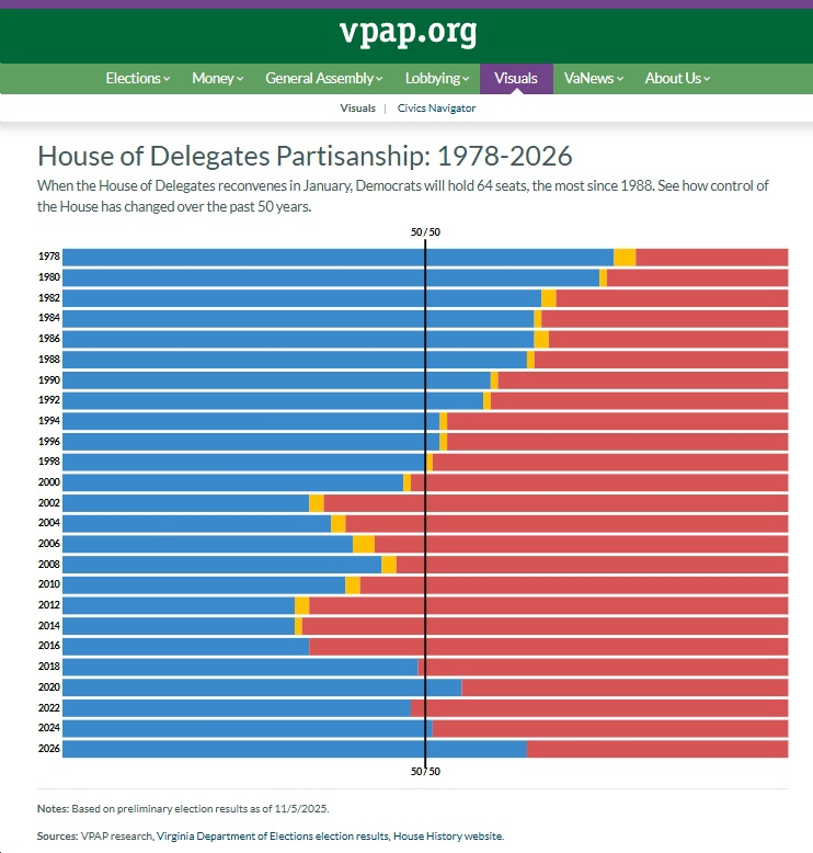 - From VPAP, Democrats will hold 64 House of Delegates seats starting in January 2026, “the most since 1988.” At Democrats’ low point, they held just 32 seats in the House of Delegates, so the 64 seats that Democrats will hold starting in January 2026 represents a *doubling* compared to that. For those of us who were active in Virginia politics during those years, it’s really astounding (in a good way!) to witness this…