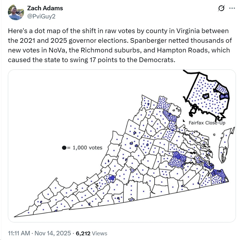 - Also worth noting, there were 3.43 million votes cast for governor this year, compared to the 4.51 million votes cast in the 2024 presidential election and 3.29 million votes cast for governor in 2021. So…turnout was up about 4% from 2021 (Spanberger got 1.98 million votes, up about 24% from the 1.60 million votes for Terry McAuliffe in 2021; Earle-Sears got 1.45 million votes, down about 13% from Youngkin’s 1.66 million in 2021).