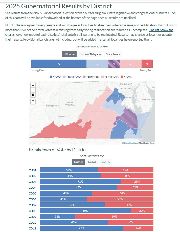 - From VPAP: Here are the gubernatorial results by US House district; as you can see, five U.S. House districts (VA03, VA04, VA08, VA10, VA11) are “Strong Dem,” with another two U.S. House districts (VA02, VA07) leaning Democratic, and with VA01 “purple”/competitive. Of course, this is BEFORE any potential mid-decade redistricting that could happen next spring, if the General Assembly passes the new constitutional amendment again, if it stands up in court, and if voters approve it next spring. But even if that doesn’t happen, both Rep. Rob Wittman (R-VA01) and Rep. Jen Kiggans (R-VA02) are in jeopardy of losing their seats next November. If we get Democratic-friendly redistricting, then potentially Rep. John McGuire (R-VA05) and possibly even Rep. Ben Cline (R-VA05) could be in competitive districts. Stay tuned…