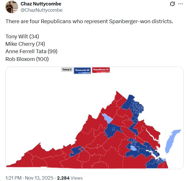 - Per Chaz Nuttycombe – whose State Navigate did an amazing job in polling (e.g., see our article on their 10/22 poll, which had Spanberger +13, Hashmi +11, Jones +5…very close to the actual results, and MUCH better than most other pollsters), election night calls and live presentation of results, etc. this election, by the way – these four Republican delegates held on this time (in Tony Wilt’s case, by just 257 votes over Democrat Andrew Payton in HD34), but could be in jeopardy going forward, given that their districts were won by Abigail Spanberger on November 4.