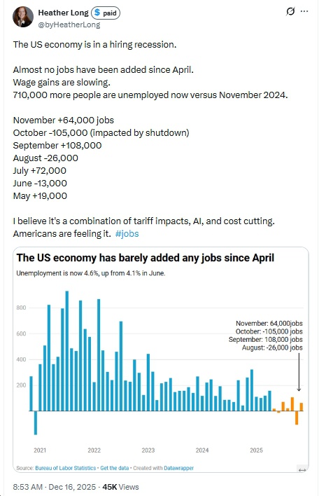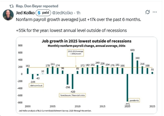 It was just 11 months ago that Virginia Governor Glenn Youngkin, speaking at Trump’s inauguration, promised a new “Golden Age” for America.  How has that prediction done so far? I mean, if you’re super-rich, an oil company, a major corporation that’s friendly with Trump, etc., you’ve done great!  Other than that…nah.  Case in point?  Check out the latest employment statistics from BLS, out this morning. A few highlights (actually, they’re more like lowlights) include: