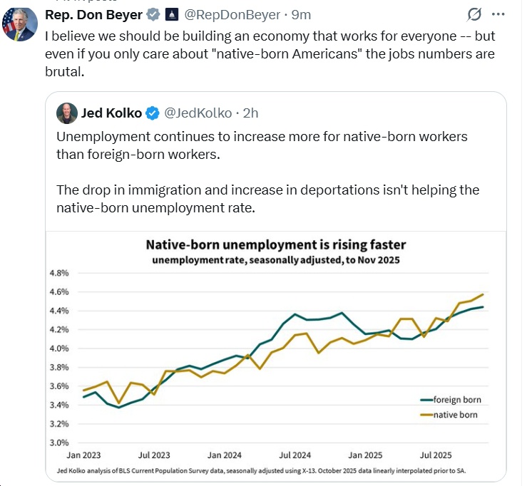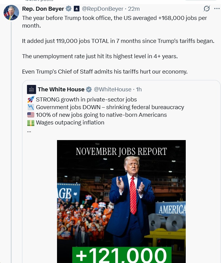 Rep. Don Beyer (D-VA08): “The year before Trump took office, the US averaged +168,000 jobs per month. It added just 119,000 jobs TOTAL in 7 months since Trump’s tariffs began. The unemployment rate just hit its highest level in 4+ years. Even Trump’s Chief of Staff admits his tariffs hurt our economy.”