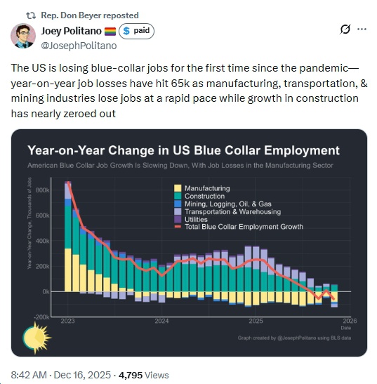 • “The US is losing blue-collar jobs for the first time since the pandemic—year-on-year job losses have hit 65k as manufacturing, transportation, & mining industries lose jobs at a rapid pace while growth in construction has nearly zeroed out”