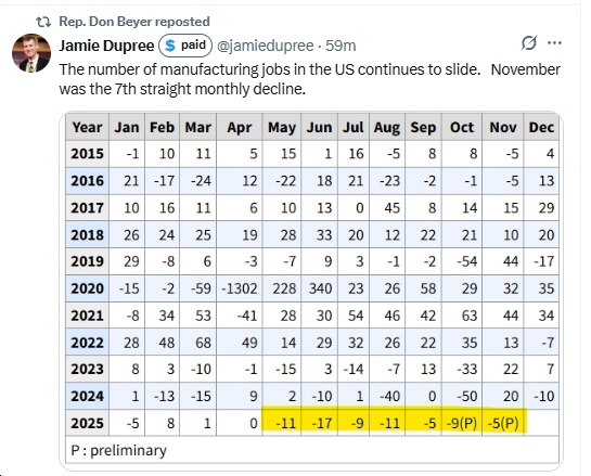 • “The number of manufacturing jobs in the US continues to slide. November was the 7th straight monthly decline.”
