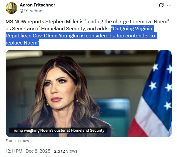 • Second, that Glenn Youngkin’s name is apparently high on the list to replace Noem is just the latest in the breathtakingly steep far-right radicalization of Youngkin, who – as late as 2020! – was busy at the Carlyle Group praising Communist China’s “unique system” (and calling China’s government “incredibly helpful”), talking positively/enthusiastically about increasing diversity and inclusion at Carlyle; making companies great via ESG (Environmental, Social, and Governance) strategies; reducing companies’ carbon footprint; etc. In short, Youngkin as late as 2020 sounded like a…”woke” liberal? Fast forward to today, and Youngkin basically has done a 180 on all of those things, which he now claims are evil incarnate. What changed? In short, Youngkin decided that he wanted to be a successful politician – governor, then president? – in the Republican Party, and that Republican Party is now 100% owned-and-operated by Trump/MAGA. So Youngkin decided that he’d do whatever it took for him to move up the ranks in THAT party, even if that required almost literally selling his soul to the devil. So that’s what he did, and continues to do, so here we are…Youngkin as a possible replacement for Kristi Noem as Secretary of Homeland Security, because Noem’s not hardcore enough for Trump, Stephen Miller, etc. apparently.
