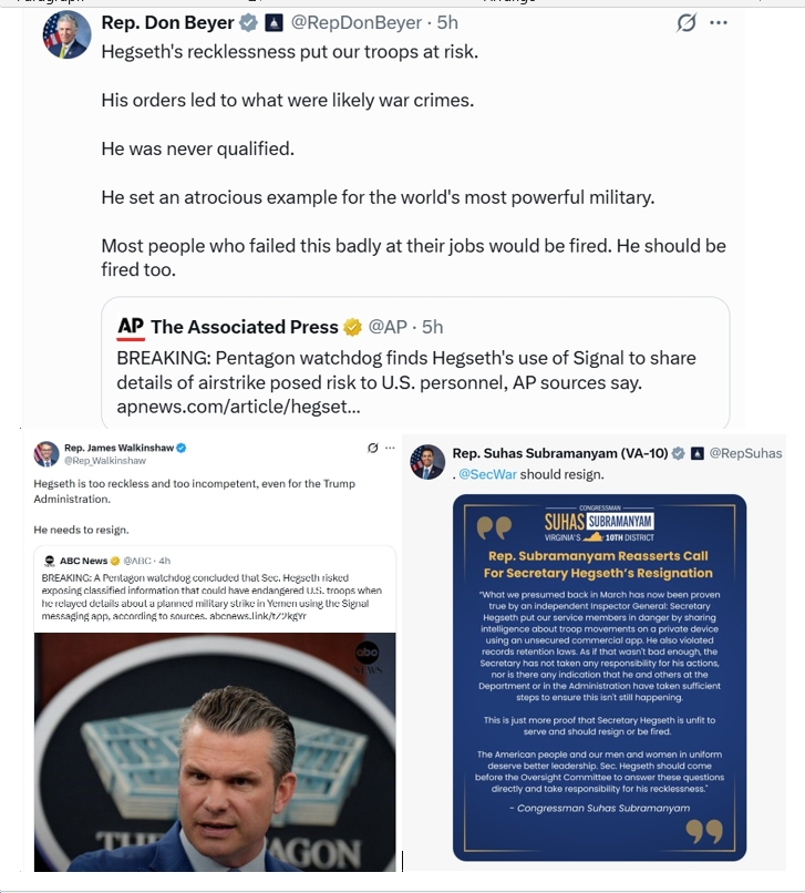 “The report also notes that the IG is aware of several other Signal chats Hegseth used for official business, underscoring that this was not an isolated lapse. It reflects a broader pattern of recklessness and poor judgment from a secretary who has repeatedly shown he is in over his head.
