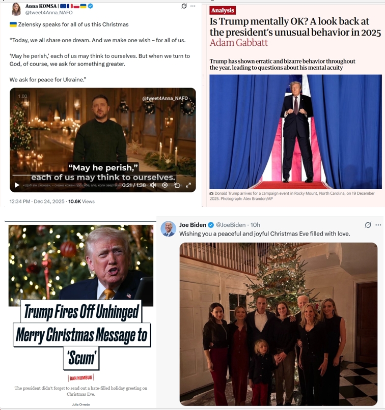 Christmas Day News: Zelensky’s Christmas Wish (“May [Putin] Perish”); “Is Trump mentally OK? A look back at the president’s unusual behavior in 2025”; “Trump Fires Off Unhinged Merry Christmas Message to ‘Scum’” While Biden Wishes “peaceful and joyful Christmas Eve filled with love”