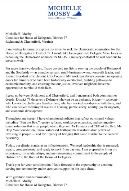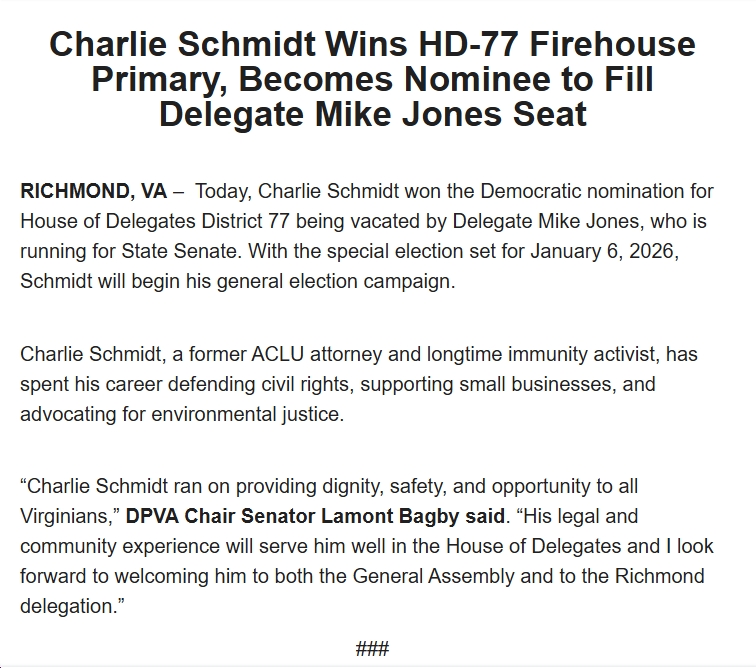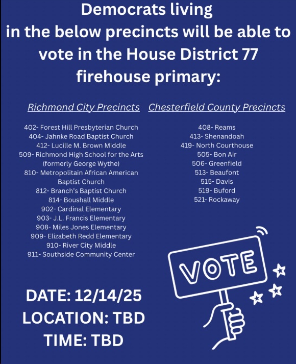 RICHMOND, VA – The HD-77 Nominating Committee has voted to hold an unassembled caucus, commonly known as a firehouse primary, to determine its nominee for the upcoming special election to fill the unexpired term of Delegate Mike Jones. Delegate Jones resigned his house seat this week after winning a firehouse primary to be the Democratic nominee to succeed Lieutenant Governor-elect Ghazala Hashmi in SD-15.