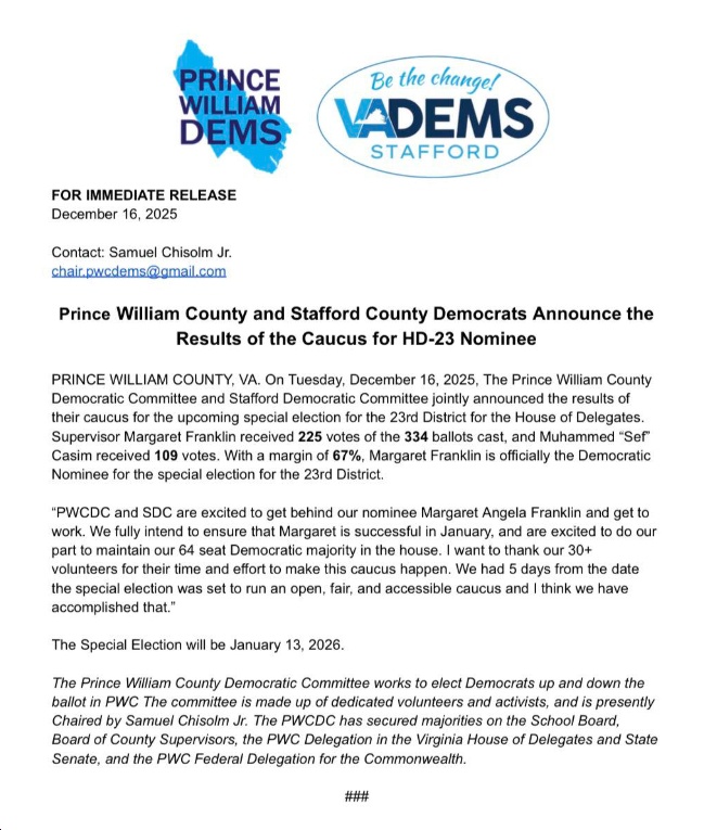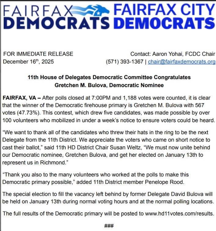 Today, Democrats in HD11 (Fairfax City/Fairfax County) and  HD23 (Prince William County/Stafford County) held “firehouse primaries” to select their nominees for the January 6, 2026 special elections to fill the seats of Del. David Bulova (D-HD11) and Del. Candi Mundon King (D-HD23), respectively. The reason for these special elections is that both Bulova and Mundon King were selected by Governor-elect Abigail Spanberger to serve in her administration, with Bulova as Secretary of Natural & Historic Resources and Mundon King as Secretary of the Commonwealth. These are both solid-blue districts, so neither should be particularly competitive on January 13, but still, you never want to take anything for granted.