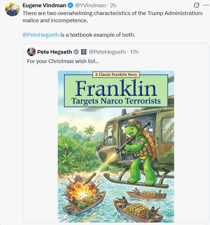 Next, here’s Rep. Eugene Vindman (D-VA07) pointing out, correctly, that “there are two overwhelming characteristics of the Trump Administration: malice and incompetence”; and that Hegseth “is a textbook example of both.” Bingo!