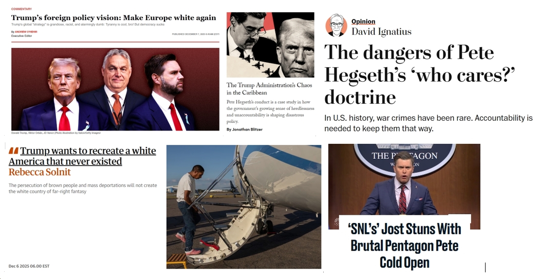 - The Trump Administration’s Chaos in the Caribbean (“Pete Hegseth’s conduct is a case study in how the government’s growing sense of heedlessness and unaccountability is shaping disastrous policy.”)