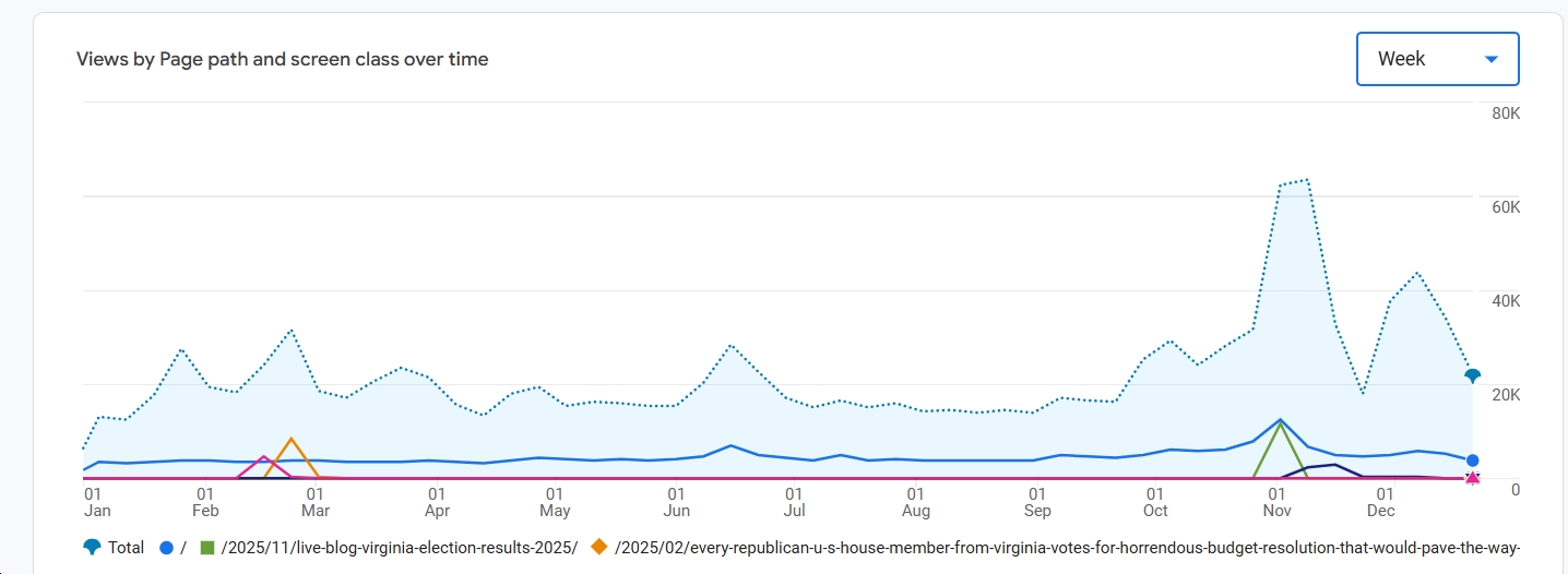 As another year comes to a close in a few days, thanks to everyone who read Blue Virginia in 2025 – a very eventful year (for good and for ill) both in national and Virginia politics. For 2026, if you want to stay updated on the latest Breaking News from Virginia politics, you can sign up for our Substack list here (or if you want to get an email once a week, click here). So what were people reading in 2025? See below for the top 50 posts, per Google Analytics, according to which Blue Virginia traffic (“views”) in 2025 approached 1.2 million. Thanks again!