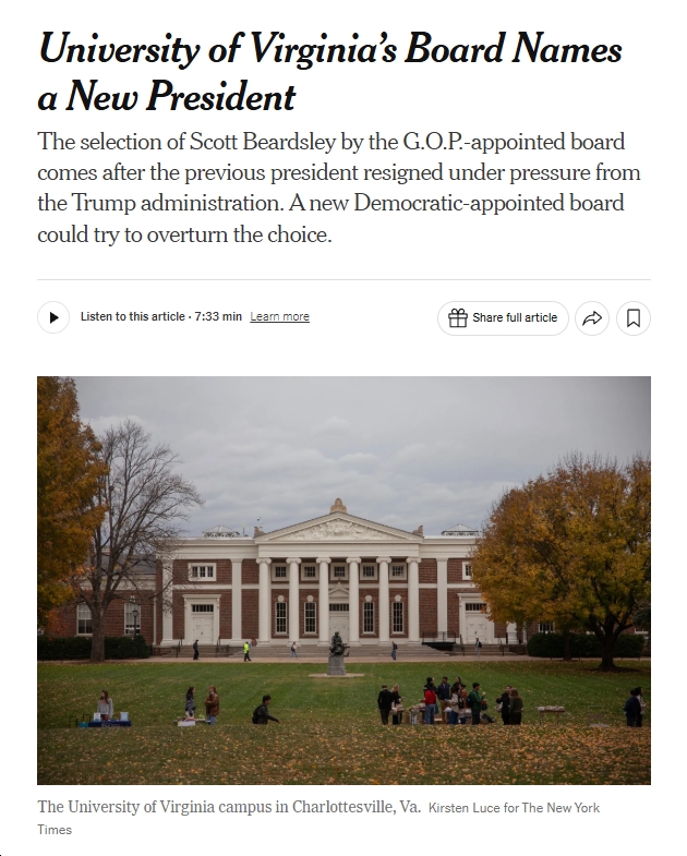 “Governor Youngkin’s decision to advance the appointment of a new president at the University of Virginia in the waning days of his administration, just as Governor-elect Abigail Spanberger prepares to assume office, raises serious concerns about process, institutional norms, and respect for a democratic transition.