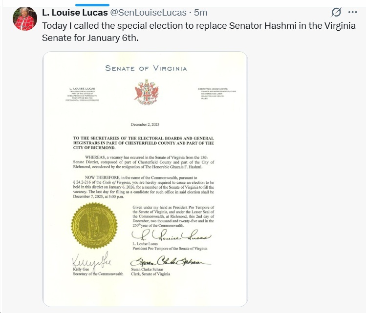 The elections never end in Virginia, right? I mean, since we have odd-year elections for Governor, Lt. Governor, Attorney General and House of Delegates, plus the usual even-numbered elections for US Senate (six-year terms), US House (two-year terms) and president (every four years), plus Democratic and Republican nomination contests, plus local elections, plus SPECIAL elections when someone resigns, dies, gets elected to another office, etc., that keeps things hopping most of the time, with rarely a dull moment politically speaking! In this case, just a few weeks since election day on November 4, we’ve now got a special election scheduled (see below for a screenshot of VA Senate President Pro Tem Louise Lucas’ announcement) for January 6, 2026 to fill the seat being vacated by State Sen. Ghazala Hashmi (D-SD15), who was of course elected Lt. Governor.