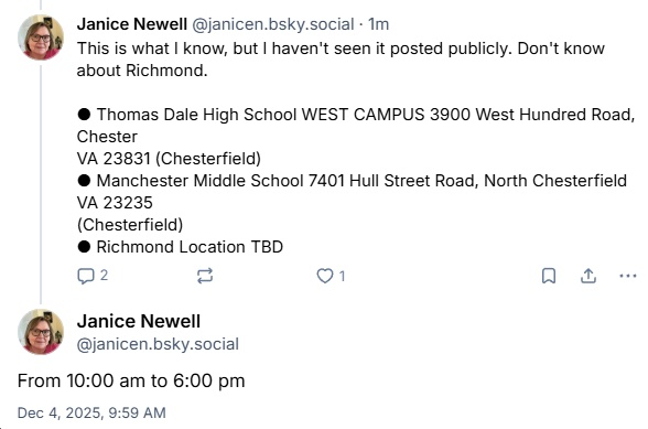 UPDATE 10:25 am Thursday: The Richmond location is Hickory Hill Community Center, 3000 Belt Blvd. And the Chesterfield info is as follows: