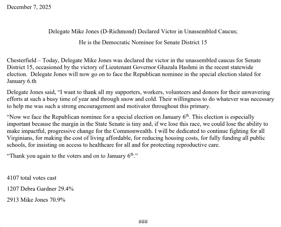Richmond, Virginia — Today, Delegate Mike Jones won the Democratic nomination for State Senate District 15 seat being vacated by Lieutenant Governor-elect Ghazala Hashmi. With the special election set for January 6, 2026, Jones will begin his general election campaign.