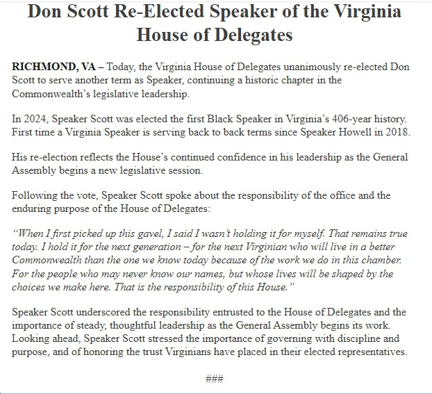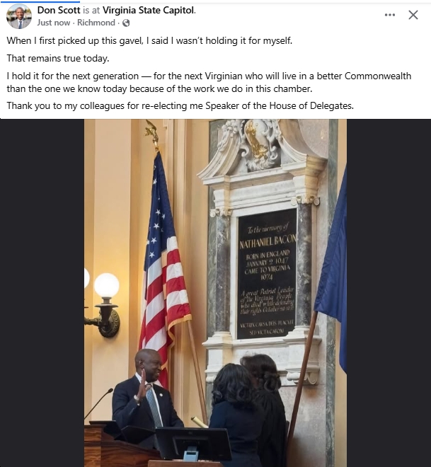 UPDATE 12:10 pm – Del. Kathy Tran now nominating Don Scott to be reelected as Speaker of the Virginia House of Delegates.