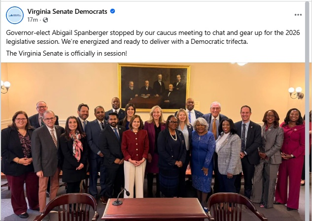 “Governor-elect Abigail Spanberger stopped by our caucus meeting to chat and gear up for the 2026 legislative session. We’re energized and ready to deliver with a Democratic trifecta. The Virginia Senate is officially in session!”