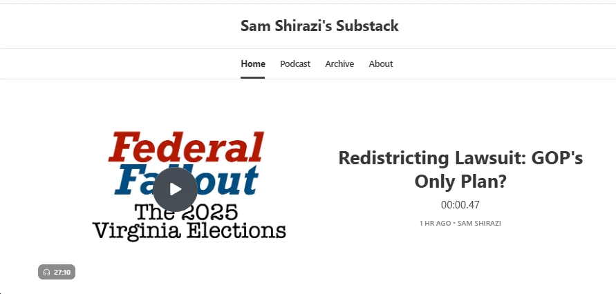 Where are we at this point with the proposed new Virginia redistricting amendment? There’s a lot going on, and it can get pretty confusing. Fortunately, super-sharp (and well-informed) Virginia-based attorney Sam Shirazi’s got us covered – to wit, check out his new “Federal Fallout” podcast, “Redistricting Lawsuit: GOP’s Only Plan?” I strongly recommend listening to the entire thing, but if you just want a few highlights/key takeaways, see below (with my comments in bold/green following what Sam Shirazi has to say).