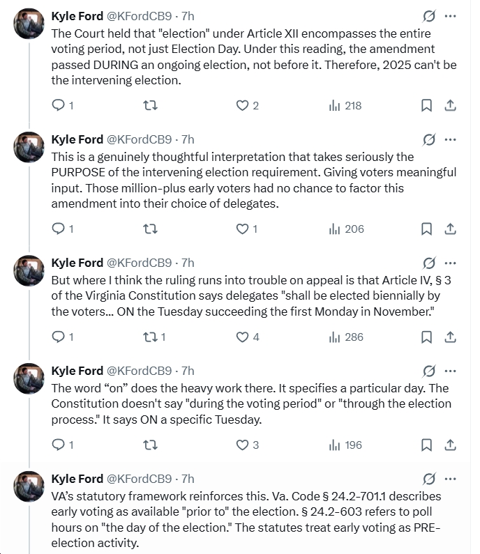 - “…where I think the ruling runs into trouble on appeal is that Article IV, § 3 of the Virginia Constitution says delegates ‘shall be elected biennially by the voters… ON the Tuesday succeeding the first Monday in November.’ The word ‘on’ does the heavy work there. It specifies a particular day. The Constitution doesn’t say ‘during the voting period’ or ‘through the election process.’ It says ON a specific Tuesday.”