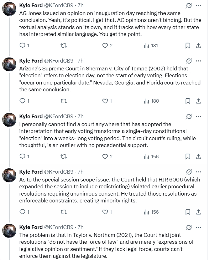 - “I personally cannot find a court anywhere that has adopted the interpretation that early voting transforms a single-day constitutional ‘election’ into a weeks-long voting period. The circuit court’s ruling, while thoughtful, is an outlier with no precedential support.”