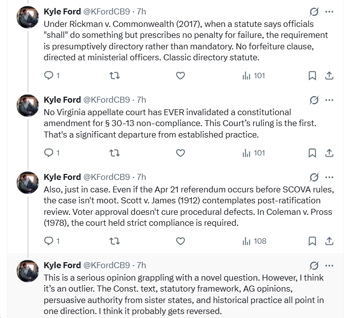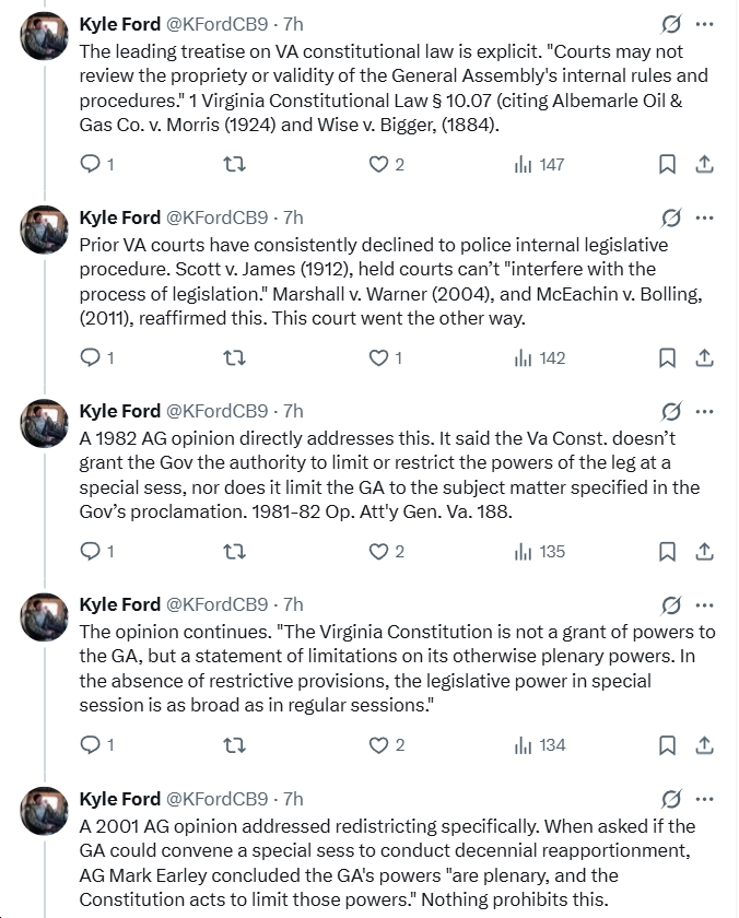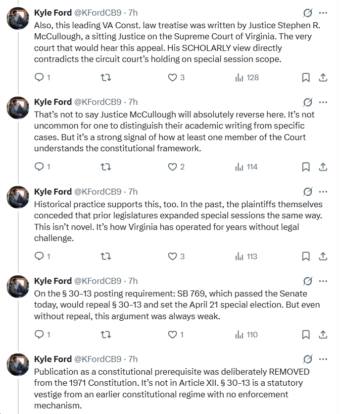 - “Also, this leading VA Const. law treatise was written by Justice Stephen R. McCullough, a sitting Justice on the Supreme Court of Virginia. The very court that would hear this appeal. His SCHOLARLY view directly contradicts the circuit court’s holding on special session scope.”