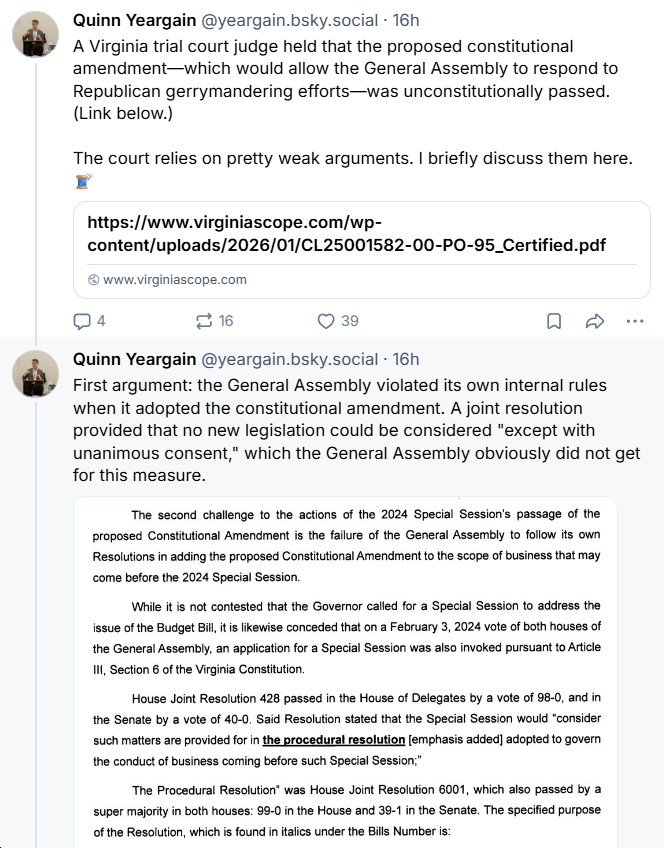 ![Analysis by Sam Shirazi on VA GOP’s Attempts to Kill the Redistricting Amendment in the Courts: If VA Supreme Court “rule[s] for the Republicans, that would be a pretty big shocker”](https://bluevirginia.us/wp-content/uploads/2026/01/shirazilawsuit-238x178.jpg)