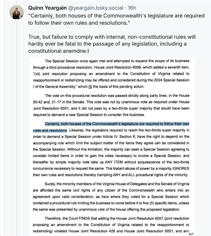 - “…the court’s definition of ‘election’ is functionally unworkable. The Virginia Constitution uses the word ‘election’ a bunch of times in the constitution. I don’t see another usage that would be consistent with the court’s definition.”