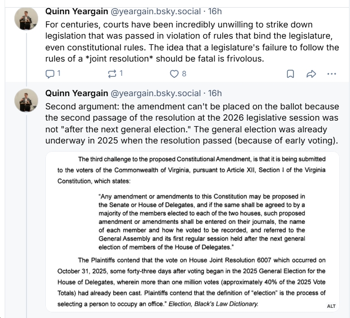 - “I do think the Virginia Supreme Court tends to be pretty deferential, especially in political things, to the elected branches of government. And so, you know, either explicitly or implicitly, I could see them saying, you know, at the end of the day, the legislature did this. It it was passed in two separate sessions of the General Assembly with majorities. And do we really want to come in and strike this down, especially when this is not the final say? Ultimately, the final say, if the referendum goes forward, is with the voters in Virginia. So the voters are the ones who ultimately have to approve this…they are thinking you know is this the type of issue where we, the Virginia Supreme Court, want to step into this and stop the process and stop the voters being able to make the ultimate call?”