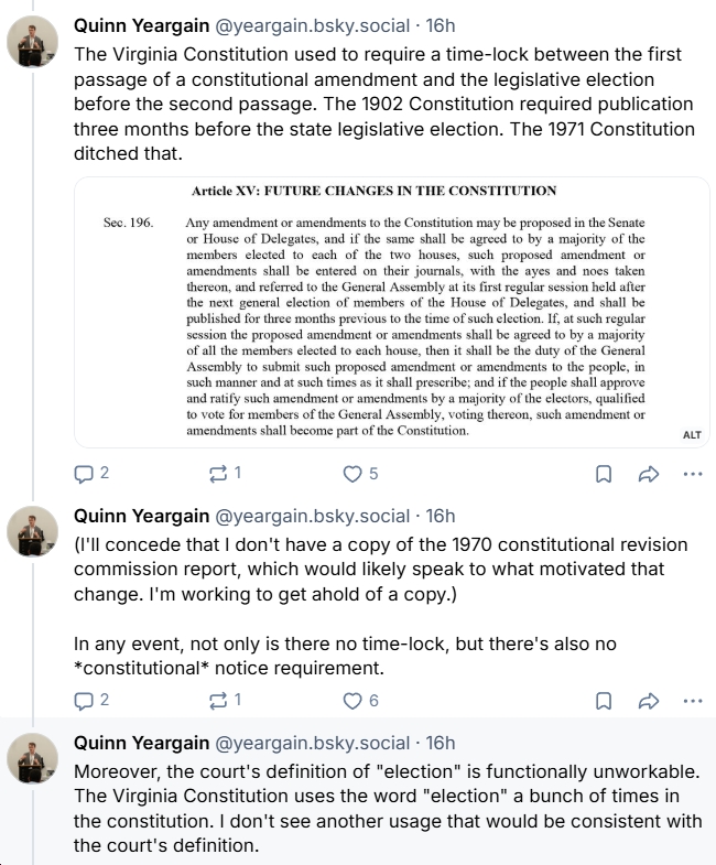 - “The Virginia Constitution used to require a time-lock between the first passage of a constitutional amendment and the legislative election before the second passage. The 1902 Constitution required publication three months before the state legislative election. The 1971 Constitution ditched that. In any event, not only is there no time-lock, but there’s also no *constitutional* notice requirement.”