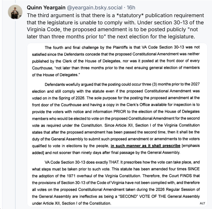 - “The second reason why the judge ruled for the Republicans, he basically looked at the Virginia state constitution and looked at the phrase after the next election And he essentially said the election was underway when the Democrats passed the proposed constitutional amendments…Again, I’m a little bit skeptical if the Virginia Supreme Court is going to uphold that…the Virginia Constitution says it has to be passed after the next general election. It doesn’t say, you know, three months before the general the Virginia general election, it has to be passed. It doesn’t say you can’t you can’t pass it after early voting started. So a lot of that is being read into the Virginia constitution when it’s not there.”