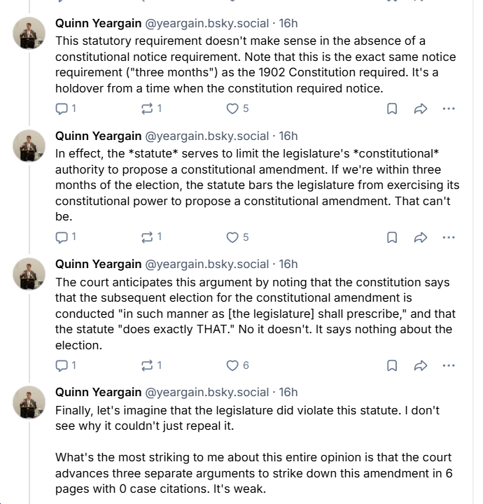 - “What’s the most striking to me about this entire opinion is that the court advances three separate arguments to strike down this amendment in 6 pages with 0 case citations. It’s weak.”