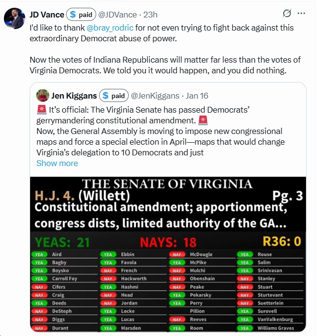 “I’d like to thank @bray_rodric for not even trying to fight back against this extraordinary Democrat abuse of power. Now the votes of Indiana Republicans will matter far less than the votes of Virginia Democrats. We told you it would happen, and you did nothing.”