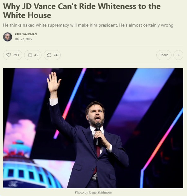 P.S. Oh, and don’t forget, JD Vance is a white nationalist who “thinks naked white supremacy will make him president.” That’s not an exaggeration, either, as Vance’s message for 2028 is literally “In the United States of America you don’t have to apologize for being white anymore.” And Glenn Youngkin’s 100% fine with that.