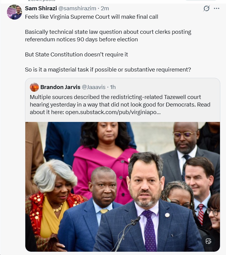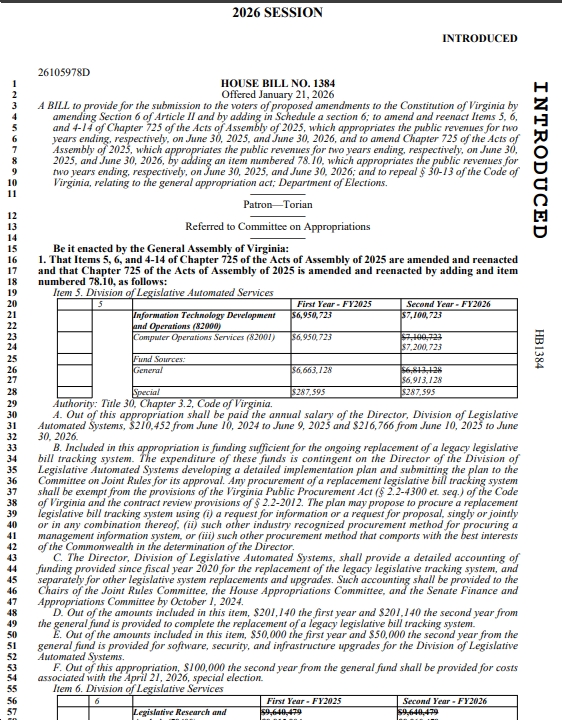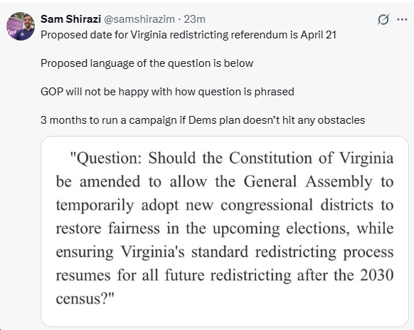 - First, here’s a link to HB1384 (Del. Luke Torian), “A BILL to provide for the submission to the voters of proposed amendments to the Constitution of Virginia.” As you can see, the proposed date for the referendum is April 21, 2026 (of course, there’s 45 days of early voting, so that should start around March 7 or so?).