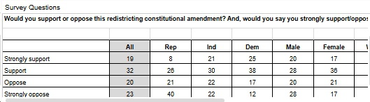6. On redistricting, while a majority of Virginians support the current way the state does redistricting (63%), a narrow majority support a constitutional amendment that would temporarily change that method to allow the state legislature to draw new district lines mid-way through the census cycle in response to other states (51% support/strongly support).