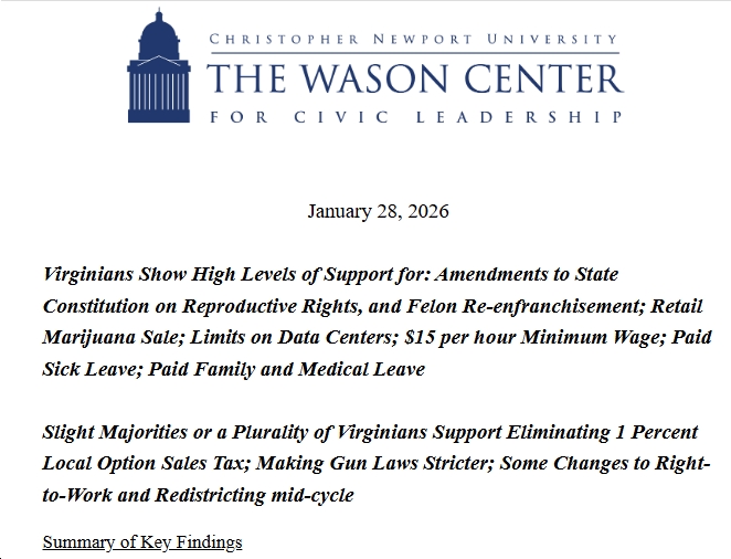 About the Wason Center: The Wason Center for Civic Leadership at Christopher Newport University empowers students to be informed and active civic leaders and conducts nonpartisan surveys of public opinion across the Commonwealth.