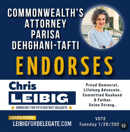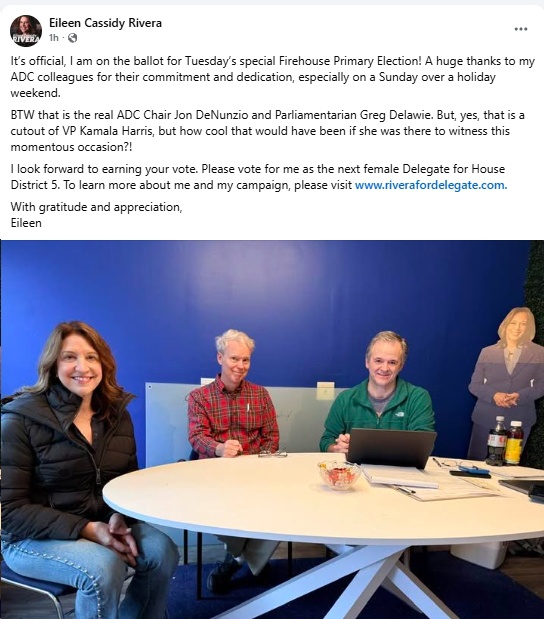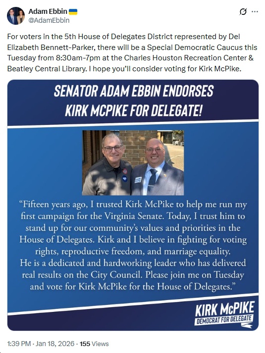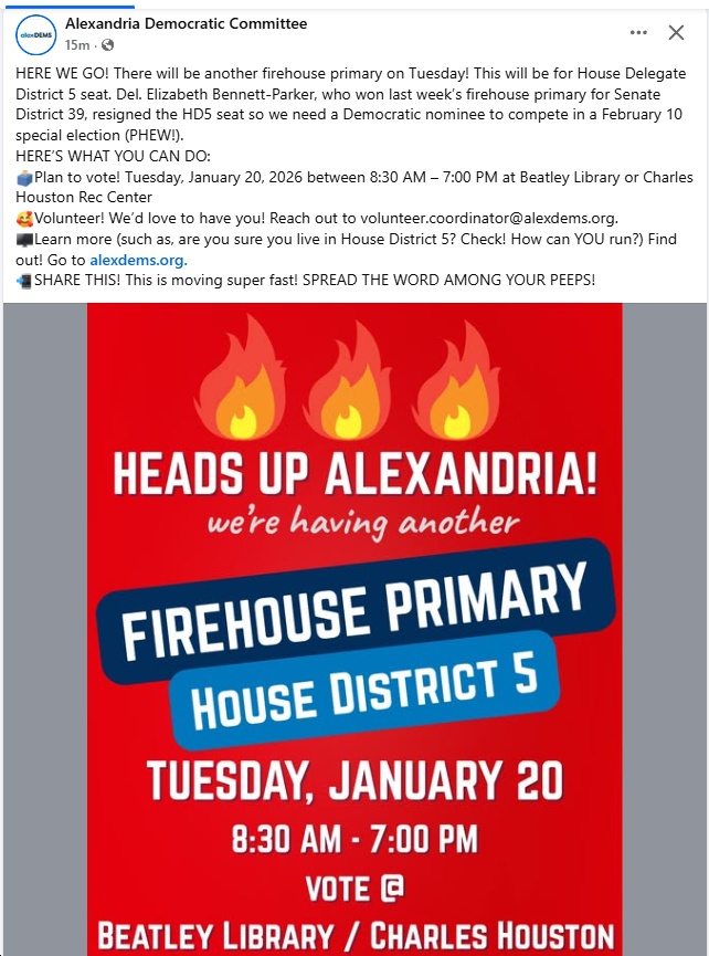 This Tuesday, per the Alexandria Democratic Committee (see below for a screenshot of their Facebook post), there will be a Democratic “firehouse primary” in HD5 (Alexandria) for the seat being vacated by Del. Elizabeth Bennett-Parker, who will almost certainly (given that it’s a deep-blue seat; went 78%-19% for Kamala Harris over Donald Trump) be moving to the State Senate (specifically, the seat currently held by Adam Ebbin, who’s moving into the Spanberger administration to work on cannabis issues). The special election for the HD5 seat will be on February 10, which is why Democrats are selecting their nominee so quickly.