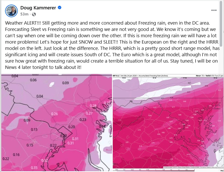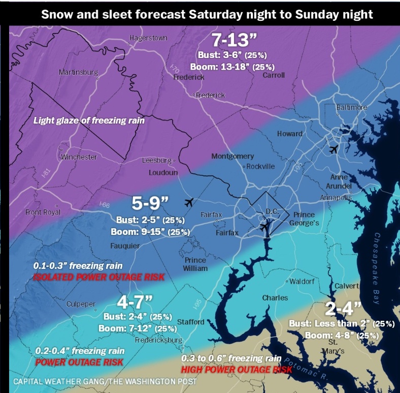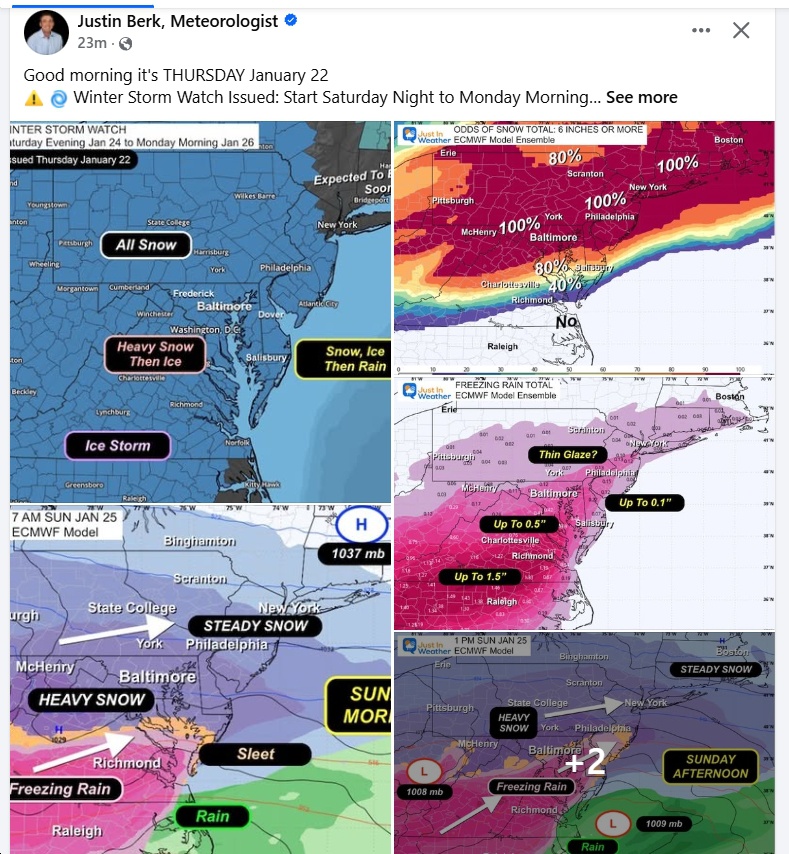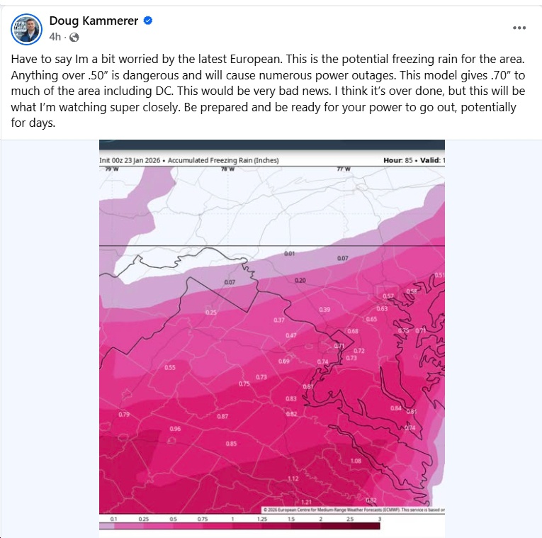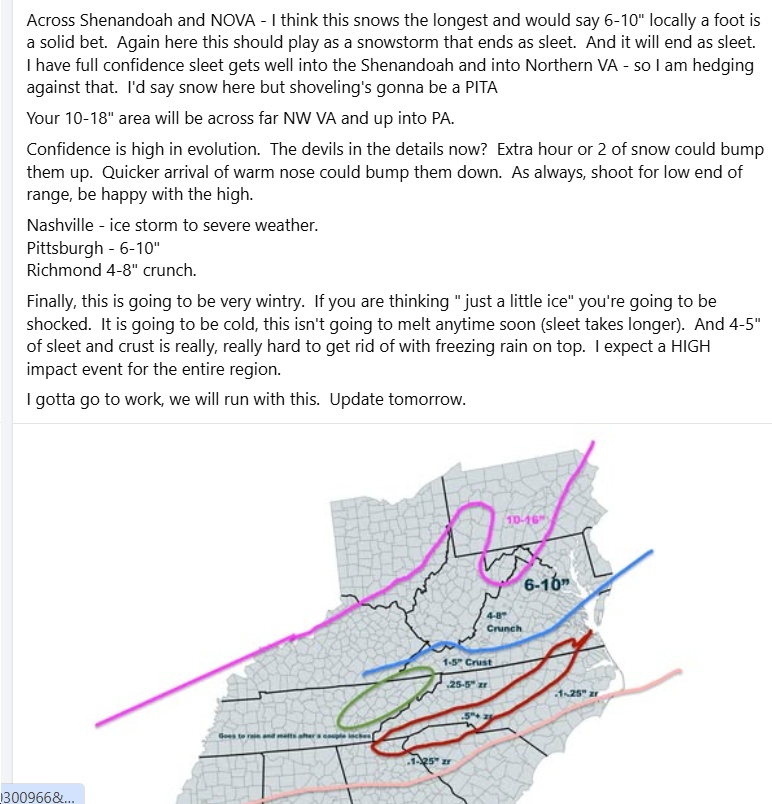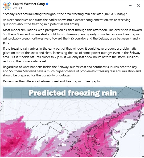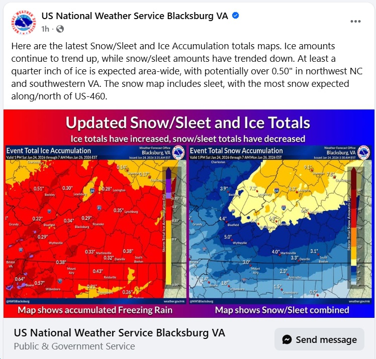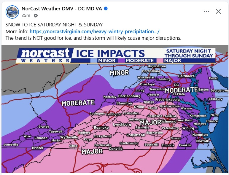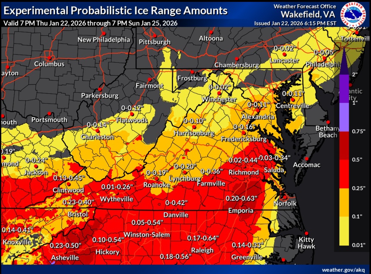 UPDATE Friday 7:47 am – Tons of info here (e.g., “When the transition to freezing rain occurs and how much freezing rain falls remain the two biggest questions. The European model has trended colder but still shows a significant amount of freezing rain. The GFS, Canadian, and NAM models favor more sleet. At this time, a decent amount of freezing rain (at least one-quarter inch) is likely across Central and South Central Virginia, as well as parts of Southwest Virginia, from Sunday afternoon through Sunday night. More sleet would limit power outages, but once ice accretion approaches one-quarter inch, the risk of numerous to widespread power outages becomes a serious concern.”)