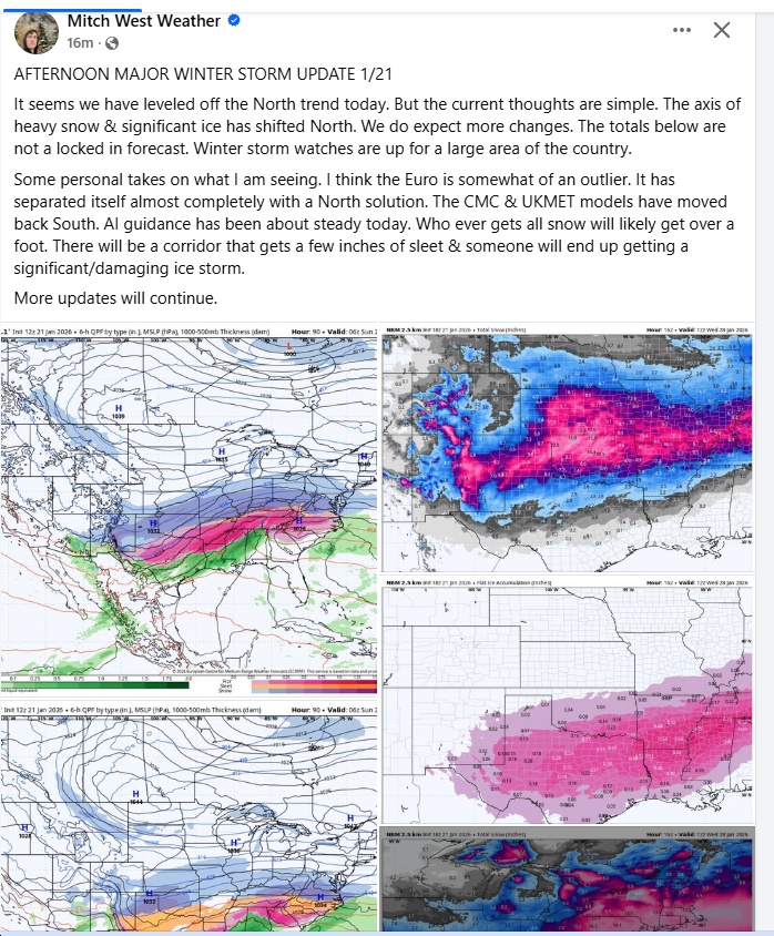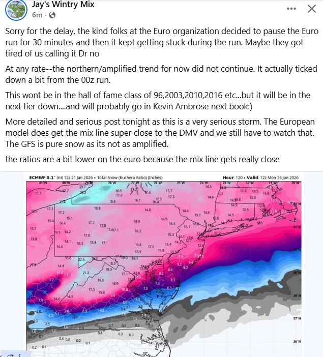 I’m going to use this post to provide updates on Winter Storm Fern, specifically with regards to its potential (and actual, once it starts) impacts on Virginia. Some meteorologists (in addition to the National Weather Service, of course) and other weather-related sites I follow include: Matthew Cappucci, Capital Weather Gang, Doug Kammerer, Blue Ridge Weather, Matt DiNardo, WxRisk.com, Justin Berk, Jay’s Wintry Mix, the Weather Channel, etc.). Oh, by the way, the storm has been nicknamed “Fern” by The Weather Channel – not an official National Weather Service name or anything…