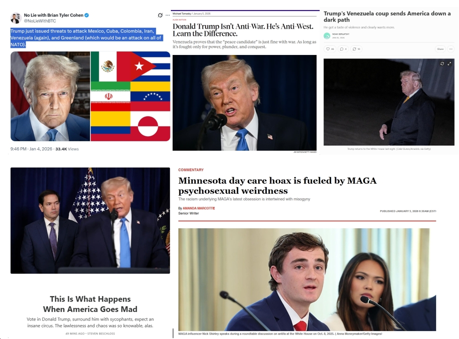- Trump Has Once Again Made Fools Out of His “Populist” Supporters (“Trump’s new GOP looks a lot like the old GOP, especially after his invasion of Venezuela.”)